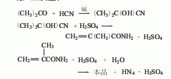 3.甲基丙烯腈水解法以异丁烯为原料,经氨氧、水解而得。4.异丁烷氧化法经氧化制得甲基丙烯醛,再经氧化而得。