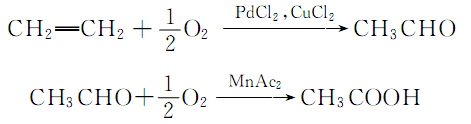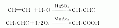 5.乙炔法:将乙炔与水在催化剂存在下直接水合得到乙醛,然后在醋酸锰催化剂的溶液中,用氧气将乙醛氧化而得。