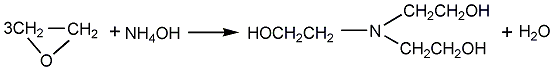 1.将环氧乙烷、氨水送入反应器中,在反应温度30-40℃,反应压力70.9-304kpa下,进行缩合反应生成一、二、三乙醇胺混合液,在90-120℃下经脱水浓缩后,送入三个减压精馏塔进行减压蒸馏,按不同沸点截取馏分,则可得纯度达99%的一乙醇胺、二乙醇胺和三乙醇胺成品。在反应过程中,如加大环氧乙烷比例,则二、三乙醇胺生成比例增大,可提高二、三乙醇胺的收率。