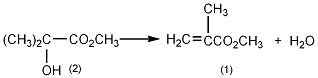 于装有搅拌器、回流冷凝器、温度基、滴液漏斗的反应瓶中,加入磷酸三酚酯75g,五氧化二磷9g,铜粉0.2g。搅拌下油浴加热至65℃,慢慢滴加2-羟基异丁酸甲酯(2)25g(0.2mol),控制反应温度不超过65℃。加完后,升温至80~100℃,并保持此温度反应3h,改为蒸馏装置,蒸出170℃以下的馏分。馏出液用10%的碳酸钠溶液洗涤,无水磷酸钠干燥,加入少量铜粉①重新蒸馏,收集97~100℃的馏分,得甲基丙烯酸甲酯②(1)16~18g。收率76%~88%。注:1、加入铜粉的目的是放置甲基丙烯酸甲酯的聚合,也可加入少量的硫黄或二胺。2、也可由丙酮、氰化钠和甲醇为原料来合成甲基丙烯酸甲酯。[30]