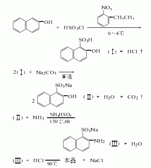 2-萘酚在邻硝基乙溶剂中,以氯磺酸磺化生成2-萘酚-1-磺酸,用纯碱中和分离得2-萘酚-1-磺酸钠,以液氨在亚氢铵存在下氨解,得2-萘胺-1-磺酸钠,再用盐酸酸化、过滤,制得2-萘胺-1-磺酸。