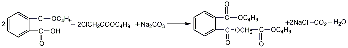 (3)将上述制备的邻二甲酸单丁酯、氯丁酯和碳酸钠按摩尔比为1:1.1:0.6的比例投入反应釜,搅拌下升温至150℃进行缩合。粗品用60-70℃的水进行水洗,再用10%的纯碱液进行碱洗,再用水洗后,加入薄膜蒸发。再用质量约为丁酯质量的2%的活性炭于80-90℃下脱色,后经压滤即得成品。