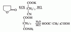 于装有搅拌器、回流冷凝器的反应瓶中,加入γ -丁内酯(2)86g(1.0mol),氰化钾72g(1.1mol),搅拌下油浴加热至190~195℃,反应2h。反应开始后剧烈进行反应,而后逐渐缓慢下来。冷至100℃,加入200ml热水使之溶解。慢慢加入浓盐酸至使刚果红试纸变色。再加入200ml浓盐酸,搅拌下加热回流1h。减压浓缩至干。将固体弄碎后加入氯仿煮沸提取,每次用氯仿200ml,重复4次。趁热过滤氯仿溶液。合并氯仿溶液,减压浓缩至约400ml,冷却,析出结晶。过滤,冷氯仿洗涤,干燥,得化合物(1)105~110g,收率79.5%~83.5%。用水重结晶,得纯品94~99g,收率71%~75%。[3]