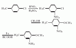 1.由对氯硝化、甲氧基化、还原而得。在15-20℃将混酸加入对氯中,在30℃搅拌2h,用水稀释,分离废酸,水洗得4-氯-3-硝基(收率30.6%)和4-氯-2-硝基(收率56.7%),用分馏和结晶法将两者分离,得4-氯-3-硝基。将其与甲醇及甲醇钠溶液反应,用中和分离,得3-硝基-4-甲氧基,收率85.6%。用水、铁粉、甲酸还原后,再用溶剂汽油多次萃取蒸馏而得。