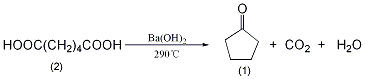 于装有蒸馏装置、温度计(伸入至接近反应瓶底部)的反应瓶中,加入己二酸(2)200g(1.34mol)与研细的氢氧化钡粉末10g,充分混合均匀。小火慢慢加热至285~290℃,有液体慢慢镏出。保持此温度,直至反应瓶中仅剩少量残渣为止。馏出物用氯化钙饱和,分出有机层,依次用稀碱、饱和食盐水洗涤,无水镁干燥,分馏,收集128~132℃的馏分,得环戊酮(1)90g,收率78%。[22]
