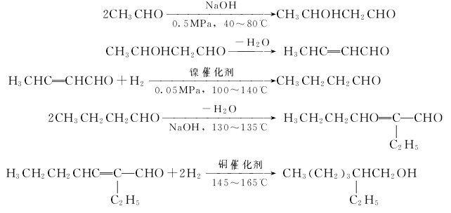 2. 乙醛缩合法 以乙醛缩合成丁醇醛,脱水得巴豆醛,加氢得正丁醛,然后将两分子正丁醛缩合脱水得2-乙基(-2-)己烯醛,再加氢得2-乙基(-1-)己醇。
