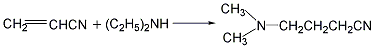 由丙烯腈与二乙胺加成后再经还原而得。将二乙胺加入反应釜,冷却至0℃,开启搅拌并滴加丙烯腈,温度逐渐自动升高到7℃。加完丙烯腈后,升温至45℃,继续搅拌反应2h,放置过夜。进行减压蒸馏,可得二乙氨基丙腈。将二乙氨基丙腈、反应介质甲醇胺饱和溶液和催化剂骨架镍加入高压釜内,通入氢气进行加氢还原反应,反应温度升至100℃,直至反应系统不再吸收氢为止。然后冷却放置,过滤回收催化剂,滤液加入蒸馏装置蒸出甲醇后进行分馏,即得成品。![]()