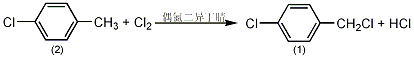 于装有温度计、回流冷凝器(顶部连一氯化钙干燥管,干燥管连接氯化氢和氯气吸收装置)、通气导管的反应瓶中,加入对氯(2)100g(0.79mol),偶氮二异丁腈0.25g,加热回流。搅拌下通入氯气,开始时可通入的稍慢,随后可加快通氯速度,接近终点时可再慢一些。感应结束后冷却,减压蒸出未反应的氯和生成的氯化氢。加入无水碳酸钠粉末以中和反应体系中的酸,直至无二氧化碳气体逸出。过滤,减压蒸馏除去低沸物,得对氯苄基氯(1),收率90%。[1]