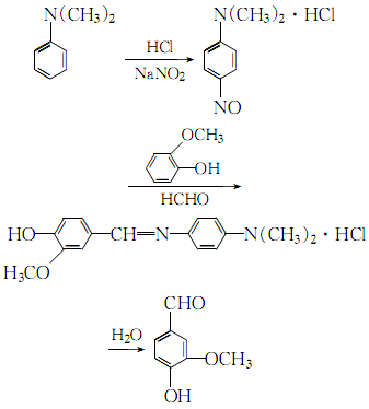 1.将n,n-二甲基胺用盐酸酸化成盐,用亚硝酸钠硝化掉得对亚硝基-n,n-胺盐酸盐。将其与愈创木酚、甲醛在41-43℃缩合。然后用萃取。次蒸馏,用重结晶,再进行第二次蒸馏,用水重结晶。50℃干燥得成品。亚纸浆废液中,含有桦柏醇结构单位的木质素磺酸盐,在碱性条件下氧化,然后水解可得到香草醛。原料消耗(kg/t)愈创木酚(98%) 1460亚硝酸钠 640n,n-二甲基胺(98%) 974盐酸(30%) 6000甲醛(99%) 320