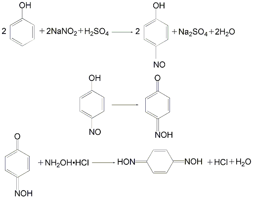 先将30%的氢氧化钠溶液加入反应釜,在搅拌下缓缓将酚加入,使之溶于氢氧化钠溶液。降温至0℃再加入亚硝酸钠和30%的,使温度保持在7~8℃进行反应,逐渐有亚硝基酚结晶析出。搅拌1h后,静置过滤,结晶经水洗,得亚硝基酚。再经转位,与盐酸羟胺水溶液混合,加热至70℃进行肟化反应。反应完成后,过滤得对醌二肟。