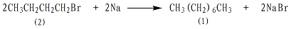 于装有搅拌器、温度计、回流冷凝器的1l反应瓶中,加入除去氧化层的金属钠(切成小块状)23g(1.0mol)。称取用无水钠干燥过的溴丁烷(2)68.5g(53ml,0.5mol),先由冷凝器顶端加入5ml,若反应没有进行,可适当加热,直至反应开始(变蓝色)。慢慢搅拌下,再加入5ml溴丁烷。当反应缓慢时再加入5ml溴丁烷,如此直至溴丁烷加完(约1.5h)。加完后放置1~2h。撤去冷凝器,用滴液漏斗滴加50ml(95%)的乙醇,约30min加完,而后于15min内滴加50ml蒸馏水。搅拌下加热回流3h,使未反应的溴丁烷分解。加入500ml水,分出上层粗品辛烷(17~18g)。用等体积的水洗涤,无水镁干燥,分馏,收集123~126℃的馏分,得辛烷① (1)约15g,收率52%。注:①用wurtz反应来制备烷烃,其中往往含有少量的不饱和烃。加入约10%体积的浓并充分挪动,直至酸层无色或仅有很浅的黄色,分出酸层,依次用10%的饱和碳酸钠、水洗涤,无水镁或无水钠干燥,而后分馏(或减压分馏),可得到高纯度的烷烃。[27]
