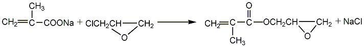 由甲基丙烯酸钠与环氧氯丙烷反应而得。原料消耗定额:甲基丙烯酸780kg/t、环氧氯丙烷690kg/t、氢氧化钠330kg/。也可以通过甲基丙烯酸甲酯与环氧丙醇的酯交换反应而获得。其中前一种方法原料易得,反应温和,是目前世界上普遍采用和方法。工艺流程:(一)甲基丙烯酸钠盐的制备     在装有搅拌器、回流冷凝器、温度计及滴液漏斗的四口瓶中,加入100ml的甲基烯酸,再加入100ml的溶剂,搅拌均匀,缓慢地滴加入103.5g的50%naoh水溶液。控制反应温度不超过55℃。滴加反应完毕后,搅拌30min,加入0.2g阻聚剂对羟基甲醚,在85-90℃、30.7-36.0kpa条件下进行减压脱水,干燥即得到钠盐,密封保存备用。(二)gma的合成    在装有搅拌器、分水器及温度计的三口烧瓶中,加入40g干燥的甲基丙烯酸钠盐、0.2g阻聚剂对羟基甲醚、1.2g催化剂(分别是几种季铵盐,一般用三乙基苄基氯化铵)、250g环氧氯丙烷,搅拌反应,反应温度控制在105-110℃,反应时间3.0h。反应完毕后,进行过滤去除nacl,所得滤液在80-80℃/6.7-80.kpa条件下减压蒸馏出环氧氯丙烷;再在100-105℃/1.1-1.6kpa条件下减压蒸馏出产品gma。