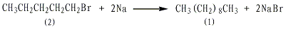 用23g(1.0mol)金属钠同75.5g(62ml,0.5mol)1-溴戊烷(2)或99g(65.5ml,0.5mol)1-碘戊烷按上述制备正辛烷的操作方法,收集171~174℃的馏分,得约28g正癸烷(1),收率79%。 [28]