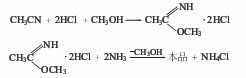 生产方法简述:由乙腈、盐酸和甲醇经加成、氨化而得。使甲醇在湍球塔内循环,压力小于26.6kpa,冷却下通入干燥的氯化氢,制成浓度为45%的氯化氢甲醇溶液。然后投入反应罐,搅拌冷却至10-5℃,滴加乙腈,并于15-20℃保温6h,得亚胺基甲盐酸盐。放入预先配制好的13%氨甲醇溶液中,在0-40℃氨解,保持ph值7-8,搅拌2-3h,降温至30℃以下,离心分离滤出氯化铵。滤液回收甲醇,冷却过滤得成品。重量投料比:乙腈:氯化氢甲醇溶液(45%):氨:甲醇=1:3:1.05:4.3。收率82%-85%。