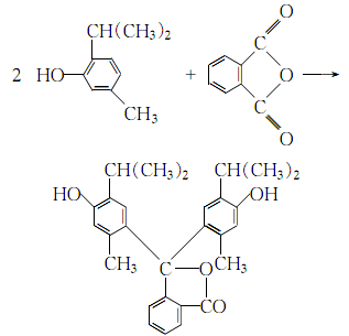 1.将麝香草酚、邻二甲酸酐和无水氯化锌混合,加热。加入及。在水浴上加热回流,倾出上层溶剂,向固体物中加入甲醇,加热。用甲醇抽提剩余的固体物,滴加水出现沉淀、冷却,便得纯品麝香草酚酞。