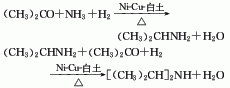 1.丙酮催化氢化氨化法丙酮气化后与一定量的氨、氢混合,在常压和适当温度下,连续进行催化反应,催化剂为ni-cu-白土,反应产物经精馏、分馏,得成品。原料消耗定额:丙酮1389kg/t、液氨376kg/t、氢气(99%)1023m3。