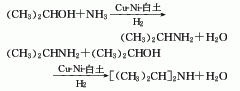 2.异丙醇催化氢化氨化法异丙醇、液氨、氢以气相按一定比例混合,在催化剂cu-ni-白土存在下,合成二异丙胺粗品,经萃取、分离、脱水、精馏得成品。反应总转化率可达86%,产品收率96%。含一异丙胺37%、二异丙胺33%、异丙醇12%、水18%,经分离得一异丙胺和二异丙胺,未反应的异丙醇循环使用。调节异丙醇和氨的配比,可改变产品的比例。