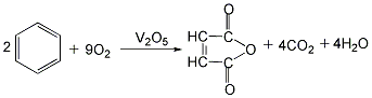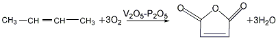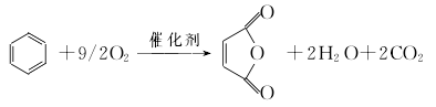 1、氧化 氧化反应器为直径1500mm、总高17500mm的沸腾床,装入微球形钒-钼催化剂2000kg。开车前先以热空气将沸腾床内催化剂层升温到350℃活化数小时。随后将冷空气以每小时150kg的流量喷入催化剂层,控制反应温度约为360℃,反应气体经沸腾床顶部分离去催化剂后输到吸收系统。氧化率约45%。2、水吸收 反应气体经过喷水文氏管骤冷,再进入直径1400mm、高7000mm的水循球喷淋吸收塔,反应气体中的顺丁烯二酸酐蒸气被水吸收,成为含量约30%的顺丁烯二酸溶液。3、共沸脱水、精馏 在共沸脱水塔的塔釜内先加混合3000kg加热至温高于136℃,釜内沸腾,此时将30%的顺丁烯二酸溶液自塔中部送入,每小时流量约为350kg,酸溶液中的水与形成共沸物自顶部蒸出,顺丁烯二酸失水成酐后溶于中,下流至塔釜内。待送入酸液总量达6000kg时,釜内中的顺丁烯二酸酐含量约为30%,此溶液输至减压精馏釜,先在釜温100℃、塔顶温110℃、真空度93.3kpa的条件下业精馏得顺丁烯二酸酐。水吸收至精馏的收率为90% 部收率40%。该法每吨顺酐消耗2000kg、140kg。