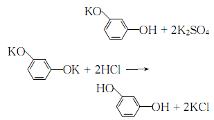 2.间二磺酸钾经碱熔、酸化后即可得到此产品。