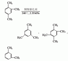 3.以偏三为原料的异构化法,分馏所得的1,3,5-三的单程产率为21.6%,纯度达95%以上,同时副产品有4%-7%的均四和9%的。反应器床层平均温度260℃,压力2.35mpa,空整1.0h-1,重整氢与油的摩尔比为10:1,催化剂为缺铝氢型丝光沸石:铜:镍:粘结剂=85.2:0.5:15。在此条件下,偏三转化率46%,选择性47%,均三单程产率21.6%。日本三菱瓦斯公司用hf-bf3进行分离、异构化,副产品含高浓度1,3,5-三的高沸物,经蒸馏精制可得该品。