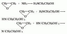 环氧乙烷、氨水溶液和循环氨一起进入不锈钢制成的反应器,内设冷却装置,反应温度30~40℃,反应压力0.7~3mpa。反应产物进入脱氨塔,脱除的氨返回氨吸收器制备氨水溶液,塔底产物经蒸发浓缩和干燥脱水即得粗乙醇胺。采用减压蒸馏将一乙醇胺、二乙醇胺和三乙醇胺分别蒸出,纯度可达到98%~99%,环氧乙烷的转化率接近100%,乙醇胺的收率为95%左右。另外,尚有少量副产物聚醚生成,在原料中配入少量的二氧化碳可以减少副产物的生成。