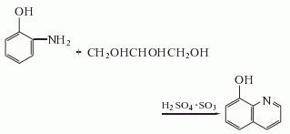 2.将邻氨基酚、邻硝基酚、甘油、冰混合,分次加入浓,将混合物加热至开始沸腾为止。然后在油浴上回流,用水蒸气蒸馏的方法除去未反应的邻硝基酚。冷却,用氢氧化钠溶液中和,并以水蒸气蒸馏的方法回收,即得8-羟基喹啉。