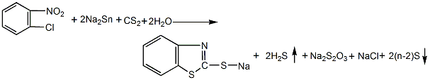 2. 以邻硝基氯为原料 邻硝基氯与还原剂硫氢化钠、多硫化钠或硫化氢反应都可还原成邻氨基硫酚。进一步与二硫化碳反应而制得促进剂m。这类方法有的反应时间较长(硫氢化钠约需20h),但都可在常压或较低压力下进行,又称常压法。