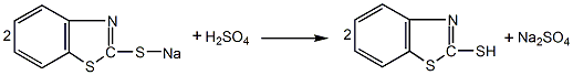 6. 常压法 将硫化钠、硫磺制成多硫化钠,然后将多硫化钠、邻硝基氯、二硫化碳在100~130℃和低于0.34mpa压力下,缩合成2-巯基并噻唑的钠盐。经25%~30%的进行一次酸化 (ph值2~3) 、水洗 (80℃) 、氢氧化钠碱溶 (ph值11.5~12) 、过滤、二次酸化 ( 温度60~65℃,ph值4~5) 、中和、水洗、干燥、粉碎,即为成品。
