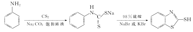 5. 工业上大多采用邻硝基氯法、胺法、硝基和胺混合法三种方法生产。胺法合成m是我国各助剂厂普遍采用的方法。在合成釜中投入一定比例的胺、cs2和硫黄,在搅拌下升温,在温度240~260℃、压力9.0~10.0mpa下保温反应3h。反应结束后于一定ph值条件下碱溶,除去不溶物,溶液经酸化、脱水和干燥后得到产品促进剂m。也可以采用胺为主要原料,先与二硫化碳生成犖取代含硫化合物,再在浓和溴化钠存在下合环反应得产物,反应均在常温常压下进行,产率达90%。合成反应式如下