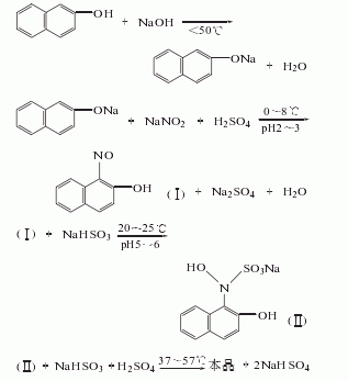 1.以2-萘酚为原料,经碱熔、亚硝化、磺化而得。原料消耗定额:2-萘酚(99%)840kg/t、亚氢钠(98%)1500kg/t、(92.5%)1600kg/t。2.将β-萘酚与氢氧化钠以1∶ 1( 摩尔比)的配比溶于水中,必要时加热,温度不得超过50℃,完全溶解后冷却至0℃,边搅拌边加入与β 萘酚等量( 摩尔比)的亚硝酸钠溶液,然后在0℃下缓慢加入40%的至ph值2 ~3,控制温度不超过5℃,加完后静置,沉淀完全后过滤,用水洗涤沉淀,所得沉淀为1-亚硝基-2-萘酚,加水搅拌成糊状,调ph=6~7,一次加入亚氢钠溶液,温度控制在50℃,搅拌至完全溶解,过滤所得滤液用水稀释后,边搅拌边慢慢加入浓,搅拌均匀后静置4~6h,过滤,所得结晶用水洗涤数次,干燥至恒重,即为成品1-氨基-2-萘酚-4- 磺酸。