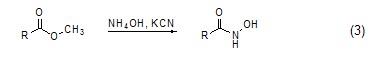有时候氰化钾参与反应,但是产物的碳链不一定延长。如在氰化钾存在下,氨水可以与羧酸酯反应生成异羟肟酸 (式3)[7]。