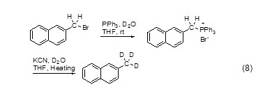 卤代烃与pph3反应生成盐,在kcn和重水存在下水解,可以得到高产率的氘代产物(式8)[11]。