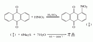 1.硝化还原法 蒽醌经混酸硝化得硝基蒽醌,反应产物过滤并用热水洗至中性后,用亚钠精制。其中2-硝基蒽醌与亚钠生成易溶于水的蒽醌-2-磺酸钠,过滤后洗涤除去之。所得1-硝基蒽醌用硫化钠还原得1-氨基蒽醌粗品,经加碱液、保险粉精制除去二氨基蒽醌后再用氧气氧化、过滤、干燥,得成品。