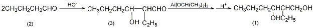 2-乙基-3-羟基己醛(3):于装有搅拌器、温度计、滴液漏斗的反应瓶中,加入正己醛(3)260g(3.6mol0),150ml,冰盐浴冷却至-3℃,开始滴加30ml(10%)的醛氧化钾溶液,开始时滴加要缓慢,以防温度超过8℃。约3h加完。加完后再搅拌反应5h。分出有机层,水洗三次,无水钠干燥。回收,减压蒸出低沸物,得粗产品2-乙基-3-羟基己醛(3)200~220g。2-乙基-1,3-己二醇(1):于装有搅拌器、回流冷凝器的反应瓶中,加入铝屑33g(1.2mol),无水异丙醇300ml,加入碘0.1g,水浴加热,生成异丙醇铝,并有大量氢气放出,当大部分的铝参加反应后,再加入无水异丙醇300ml。回流6h以使反应完全。反应体系呈深灰色。冷后加入前面制得的2-乙基-3-羟基己醛(3),安上有填充物的分馏柱,不断蒸出生成的丙酮。随着反应的的进行,丙酮逐渐蒸完,异丙醇蒸出,直至柱顶温度达到80℃(此时为异丙醇,可回收再利用)。冷却,以15%的烯调至弱酸性,有油状物析出。分出油状物,水洗三次,无水钠干燥,而后进行分馏,收集238~242℃的馏分,得2-乙基-1,3-己二醇(1)60g,收率23%。[1]