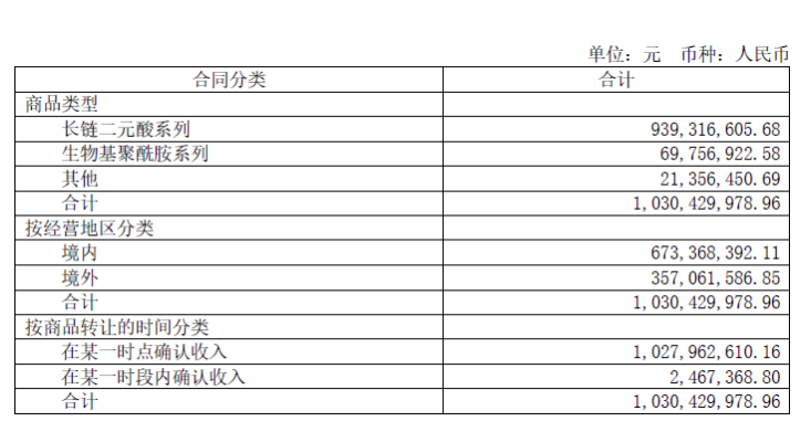 具体来看,今年上半年长链二元酸系列销售收入9.39亿元,占比达91.2%;生物基聚酰胺系列销售收入6975.69万元,占比6.77%。