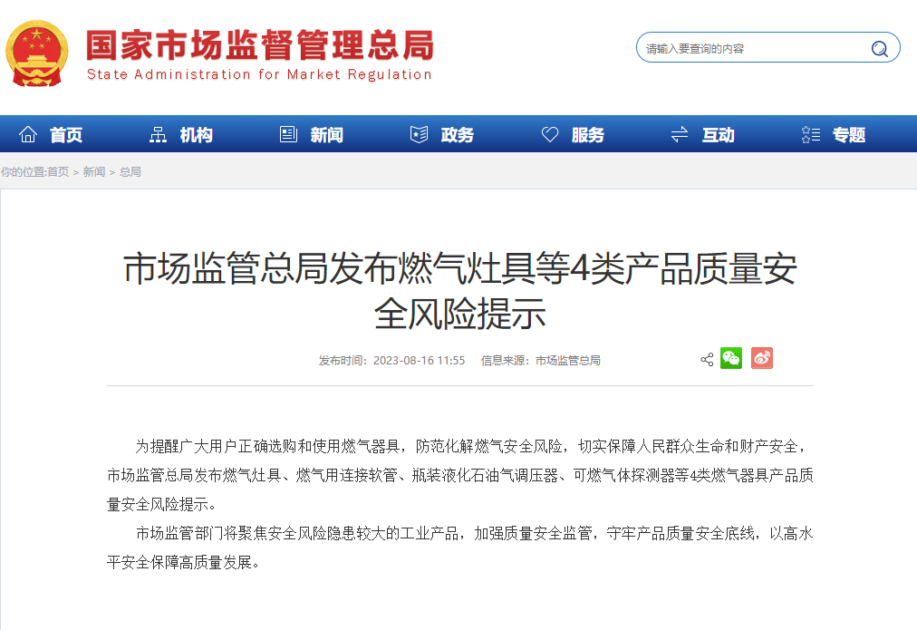 为提醒广大用户正确选购和使用燃气器具,防范化解燃气安全风险,切实保障人民群众生命和财产安全,市场监管总局发布燃气灶具、燃气用连接软管、瓶装液化石油气调压器、可燃气体探测器等4类燃气器具产品质量安全风险提示。